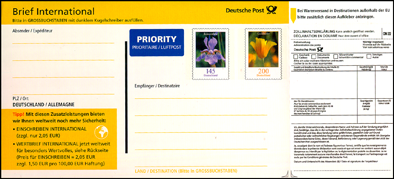 Zur Frankatur von Auslandsbriefen hat die Deutsche Post einen neuen Aufkleber "Brief International" herausgegeben. In den Aufkleber eingedruckt sind die Blumenwerte zu 145 und 200 Cent. Anhängend ist eine Zollinhaltserklärung. Zu diesem Aufkleber gibt es noch bedruckte Kartonkuverts im DIN A4-Format (ohne Werteindruck).